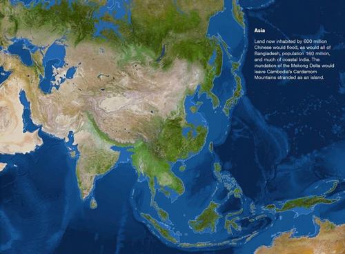 中国有6亿人口居住的辽东半岛、华北华东大部分、江浙沿海发达地区将被海水淹没;有着1.6亿人口的孟加拉国几乎全部沉入海水;目前的绝大部分印度沿海地区将消失;东南亚湄公河流域肆虐的洪水将包围柬埔寨西南部绵延数百公里、平均海拔1000米以上的豆蔻山脉,使其变成一座“孤岛”。