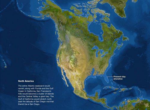 包括墨西哥湾和美国佛罗里达州在内的大西洋西海岸线消失;加利福尼亚的旧金山地区变成群岛;美国西部的中央大峡谷变成新的海湾;圣迭戈被淹没。