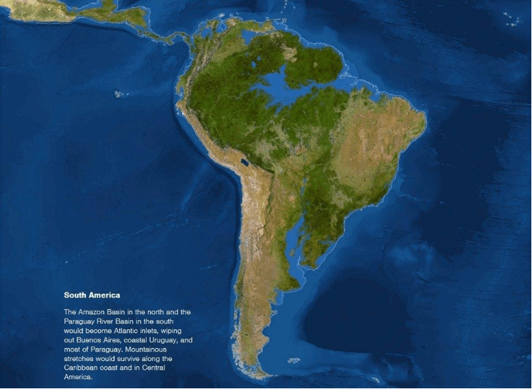 北部亚马逊流域和南部巴拉圭河流域将成为大西洋新的入海口;阿根廷首都布宜诺斯艾利斯、乌拉圭沿海地区、巴拉圭的大部分地区将被彻底摧毁;但加勒比海沿岸和中美洲的多山地区得以幸存。