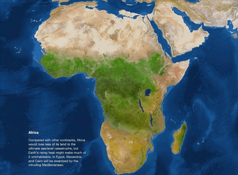 不同于其他大洲,非洲的海岸线似乎将“幸存”下来;不过,地球表面大幅上升的温度让人难以忍受;南地中海的海水倒灌将淹没埃及亚历山大和开罗两座历史名城。