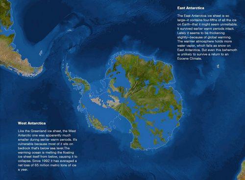 全球气温的持续上升积聚来大量水汽,让南极东部成为大雪纷飞的世界;而南极洲西部的冰盾也跟格陵兰岛上的冰盾一样逐渐消失在海中。