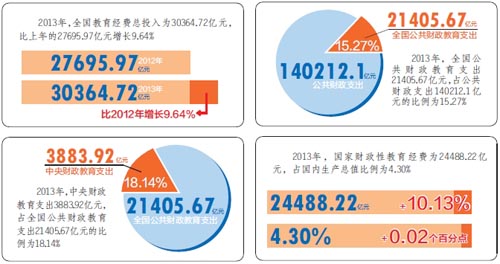 根据统计公告,2013年,全国教育经费总投入为30364.72亿元,比上年的27695.97亿元增长9.64%。其中,国家财政性教育经费为24488.22亿元,比上年的22236.23亿元增长10.13%。2013年全国公共财政教育支出为21405.67亿元,比上年的20314.17亿元增长5.37%。其中,中央财政教育支出3883.92亿元,比上年增长2.7%。全国公共财政教育支出占公共财政支出140212.1亿元的比例为15.27%,比上年的16.13%降低了0.86个百分点。